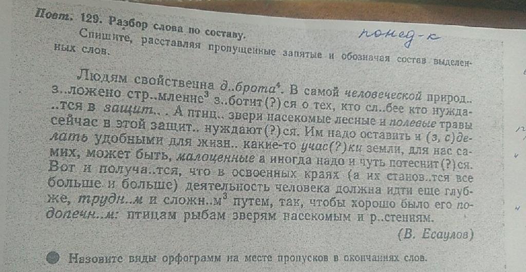 Людям свойсвенна доброта. В самой человеческой природ[е] (1 скл, П. П) заложено стремление заботиться о тех, кто слабее, кто нужда[ет]ся (что делает?) в защит[е] (1 скл, П.П). А птиц[ы] (находится в окончании), звери, насекомые, лесные и полевые травы, сейчас в этой защит[е] (1 скл, П.П) нужда[ют]ся (что делают?). Им надо оставить и сделать для удобными для жизн[и] (3 скл, Р.П) какие-то участки земли, для нас самих, может быть, малоценные, а и ногда надо и чуть потесни[ть]ся (что сделать?). Вот и получа[ет]ся (что делает?), что в освоенных краях (а их станов[ит]ся (что делает?) всё больше и больше) деятельность человека должна идти ещё глубже, трудн[ым] и сложн[ым] (каким?) путём, так, чтобы хорошо было его подопечн[ым] (каким?): птицам, рыбам, зверям, насекомым и растениям.