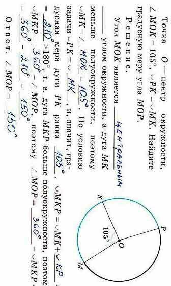 Точка OO — центр окружности, angle MOK=105degree∠MOK=105°, smallsmile PK=smallsmile MK⌣PK=⌣MK. Найдите градусную меру угла angle MOP∠MOP