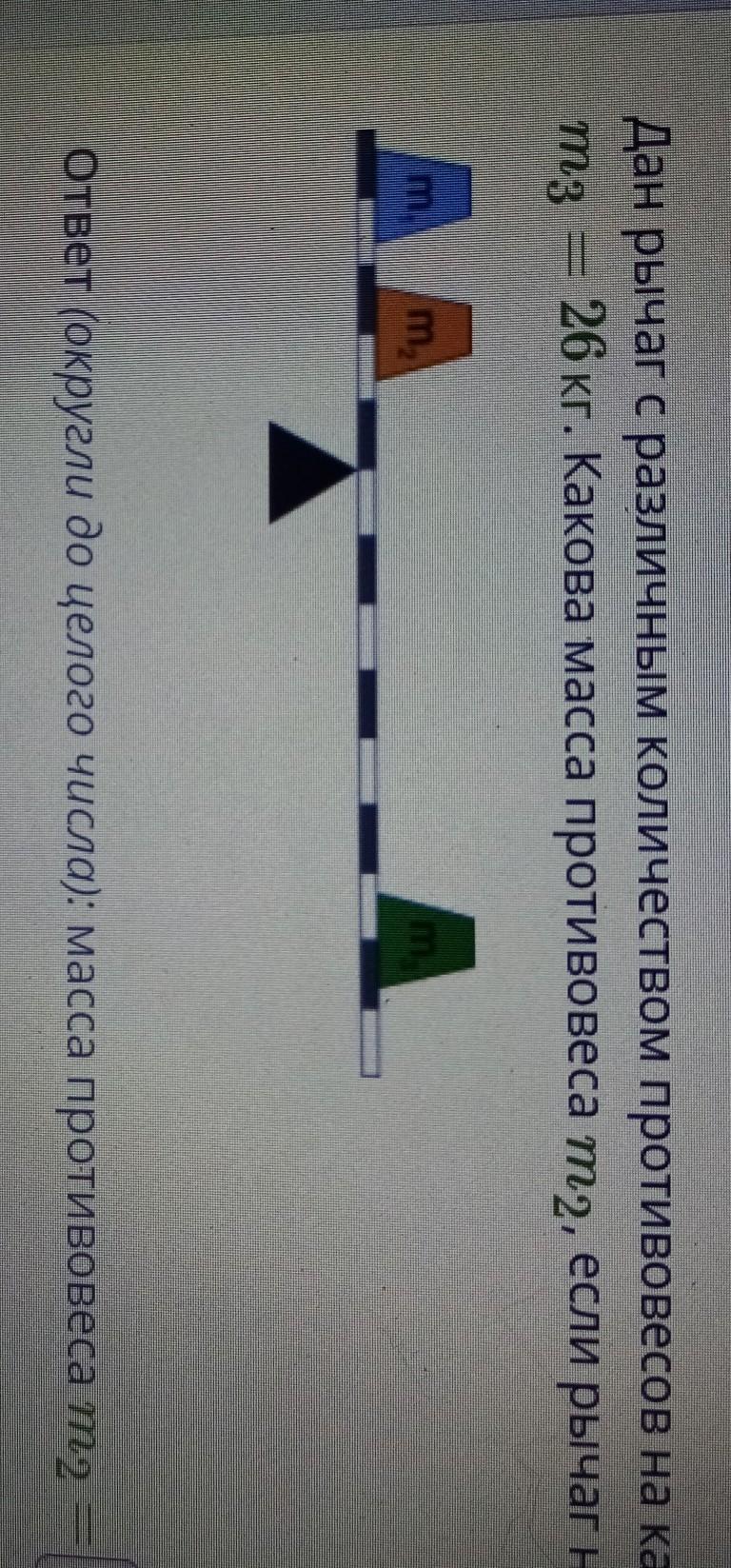 Дан рычаг с различным количеством противовесов на каждой стороне. Массы противовесов m1=7 кг и m3=26. Какова масса противовеса m3, если рычаг находится в равновесии. Ответ округлить до целого числа