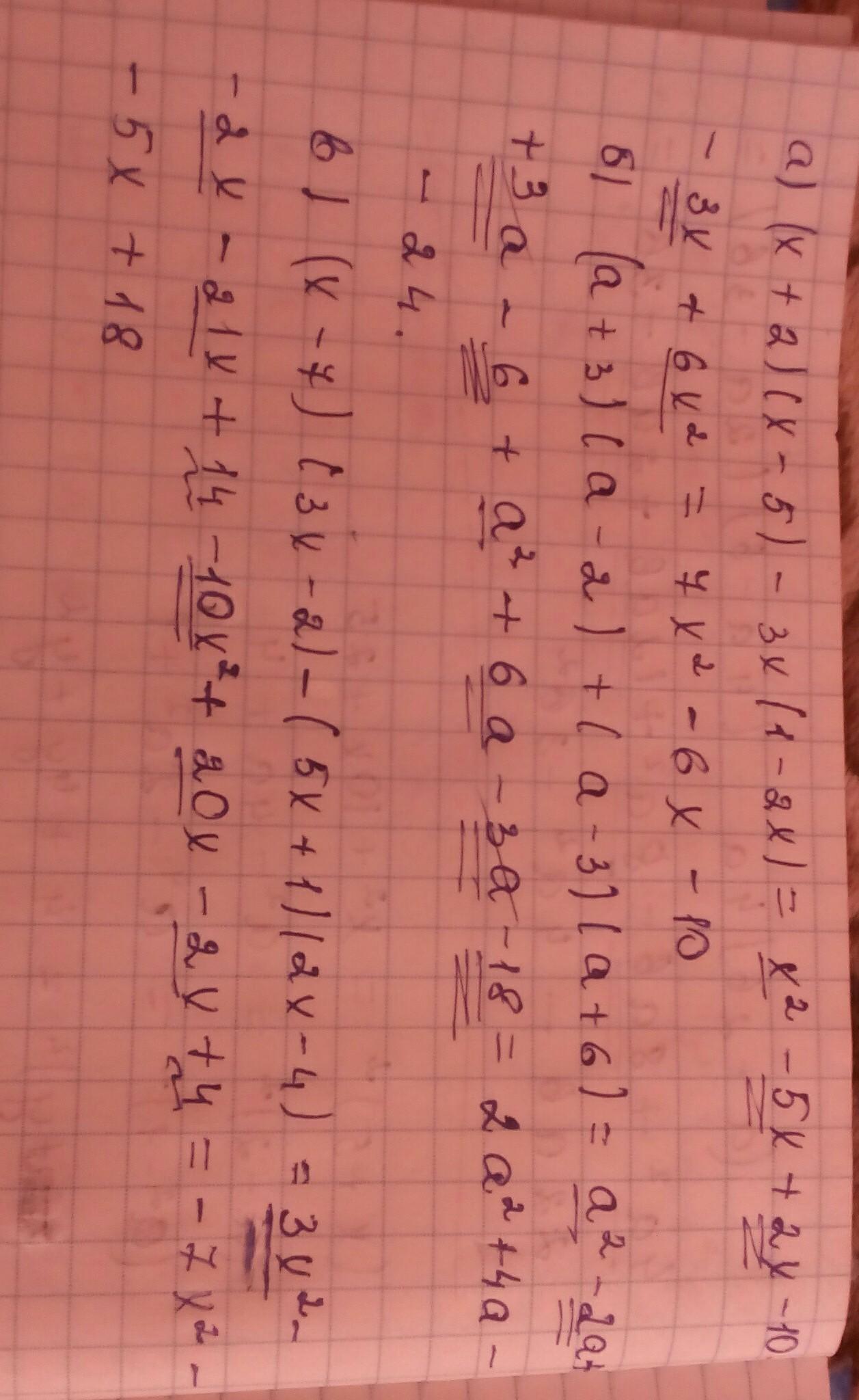 а) (х + 2)(х – 5) -3х(1 – 2х), б) (а + 3)(а – 2) + (а – 3)(а + 6),
