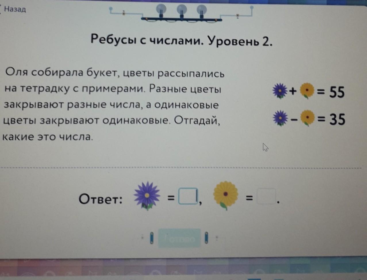 Разные цветы закрывают разные числа, а одинаковые закрывают одинаковые числа ф+ж+к=36 ф+ж=35 ж+к=16