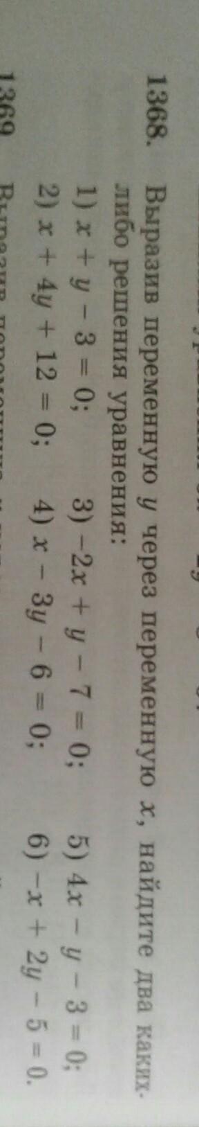 Помогите пожалуйста Выразив переменную Y через переменную X найдите два каких-либо решения уравнения.x+y-3=0 x+4y+12=0 -2x+y-7=0 x-3y-6=0 4x-y-3=0 -X+2y-5=0