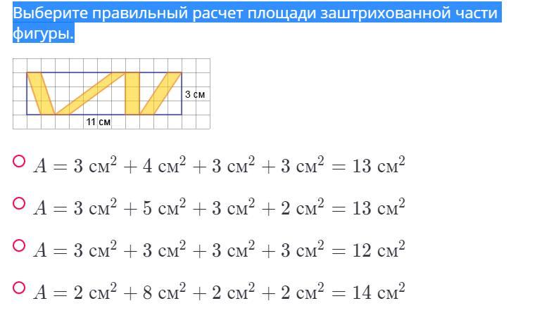 Выберите правильный расчет площади заштрихованной части фигуры.