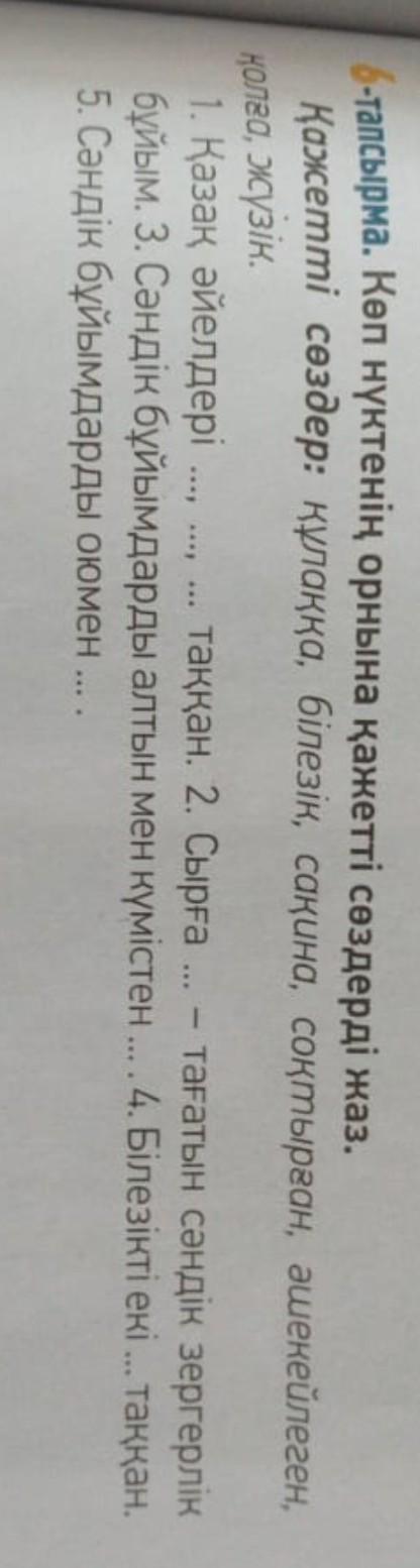 1. Қазақ әйелдері білезік, сақина, жүзік таққан. Сырға - құлаққа тағатын сәндік зергерлік бұйым. Сәндік бұйымдарды алтын мен күмістен соқтырған. Білезікті екі қолға таққан. Сәндік бұйымдарды оюмен әшекейлеген.