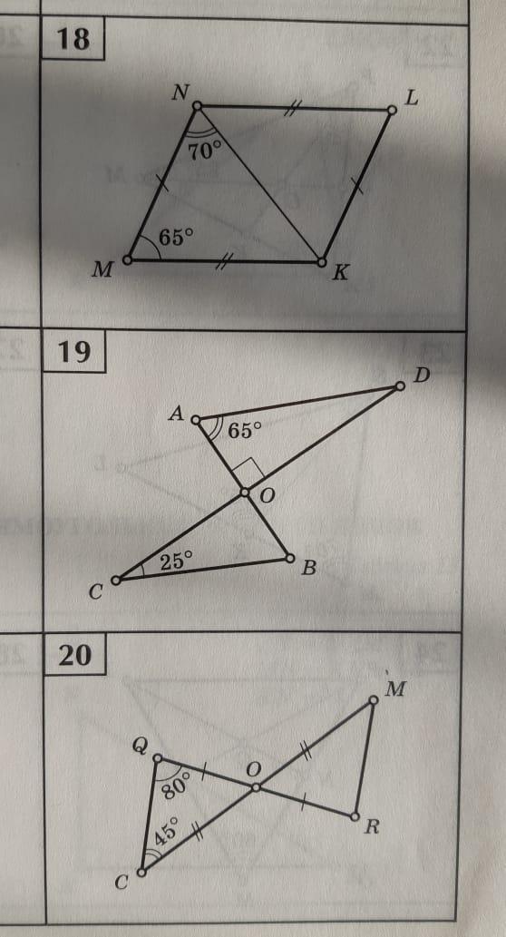 18. Диагональ параллелограмма делит его на два одинаковых треугольника. Угол KMN=NLK=65.Угол MNK=NKL=70 ,так как они накрест лежащие.Угол MKN=180-(65+70)=45.Угол KNL=MKN=45.