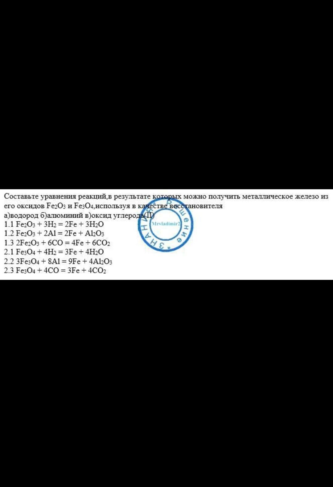 №1. Составьте уравнения реакций получения железа из его оксидов Fe2O3 и Fe3O4 , используя в качестве восстановителя: а) водород; б) алюминий; в) оксид углерода (II). Для каждой реакции составьте электронный баланс.