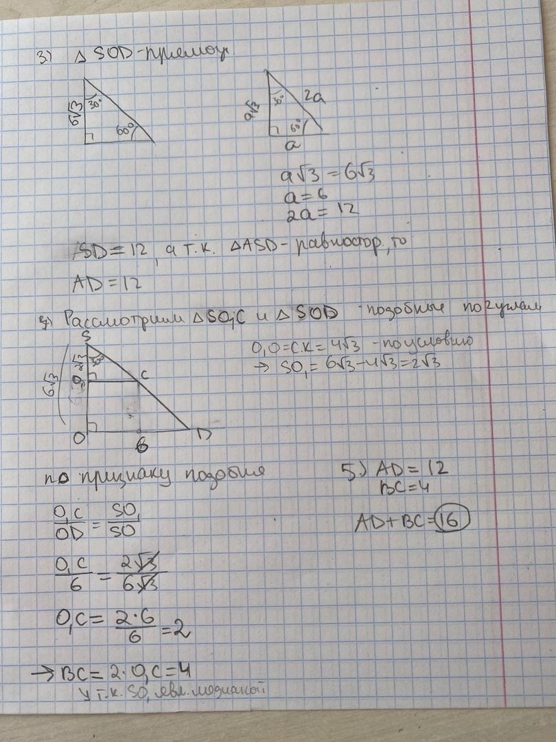 Высота равнобедренной трапеции равна 4√3, а продолжения боковых сторон пересекаются на расстоянии 6√3 от большего основания под углом 60 градусов. Найдите сумму оснований трапеций.