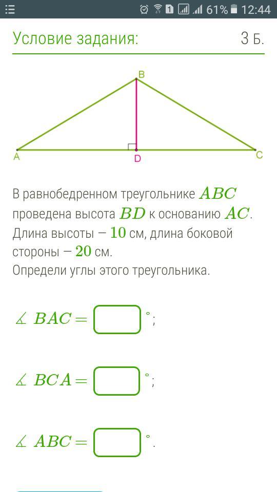 Гипотенуза =АВ=20, а катет=ВD=10, исходя из этого угол А=30 градусам. ( тут действует : катет, который лежит напротив угла 30 градусов равняется половине гипотенузы)