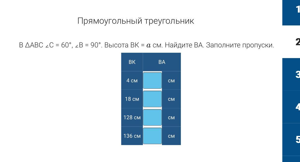 В ∆АВС ∠С = 60°, ∠В = 90°. Высота ВК = a см. Найдите ВА.
