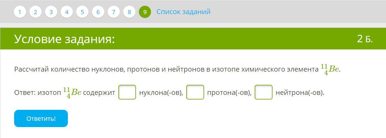 Содержит 4 протона, 7 нейтронов, 11 нуклонов.