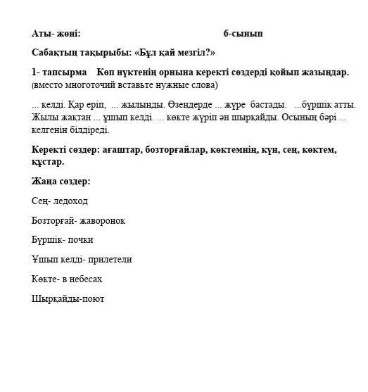 Көктем келді. Қар еріп, күн жылынды. Өзендерде сең жүре бастады, ағаштар бүршік атты. Жылы жақтан құстар ұшып келді, бозторғайлар көкте жүріп ән шырқайды. Осының бәрі көктемнің келгенін білдіреді.
