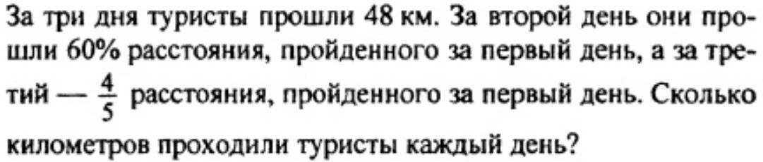 Пусть в первый день туристы прошли х км. Тогда во второй день они прошли 3/5*х км., а в третий день они прошли 4/5*х км. Составим уравнение:
