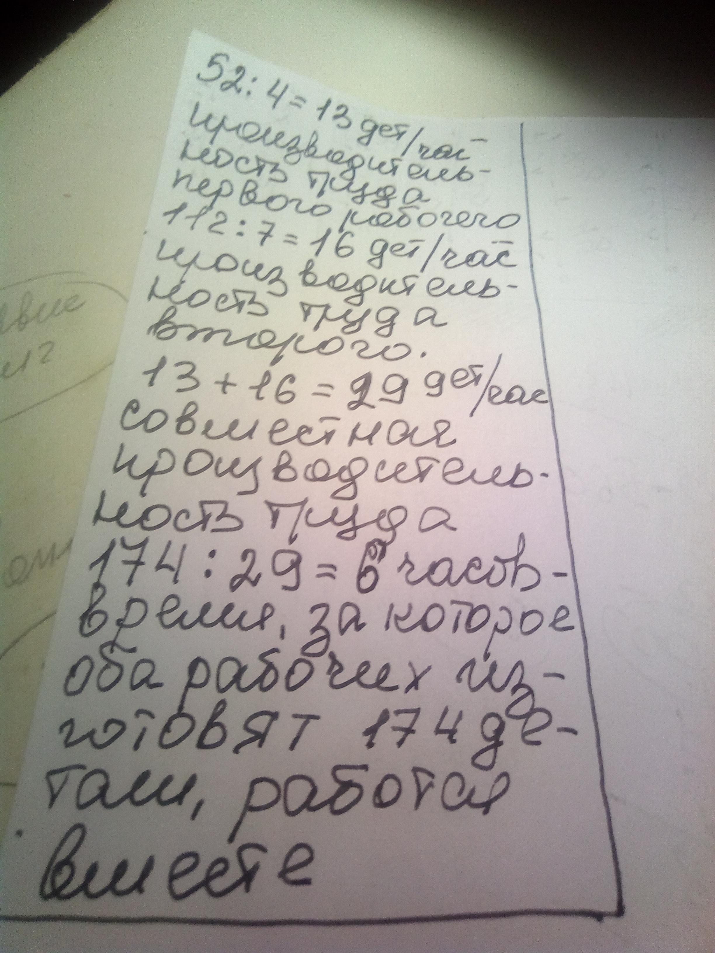 один рабочий может изготовить 52 детали за 4 часа. а другой 112 деталей за 7 часов. за какое время они изготовят 174 детали работая вместе? помогите пожалуйста с объеснением