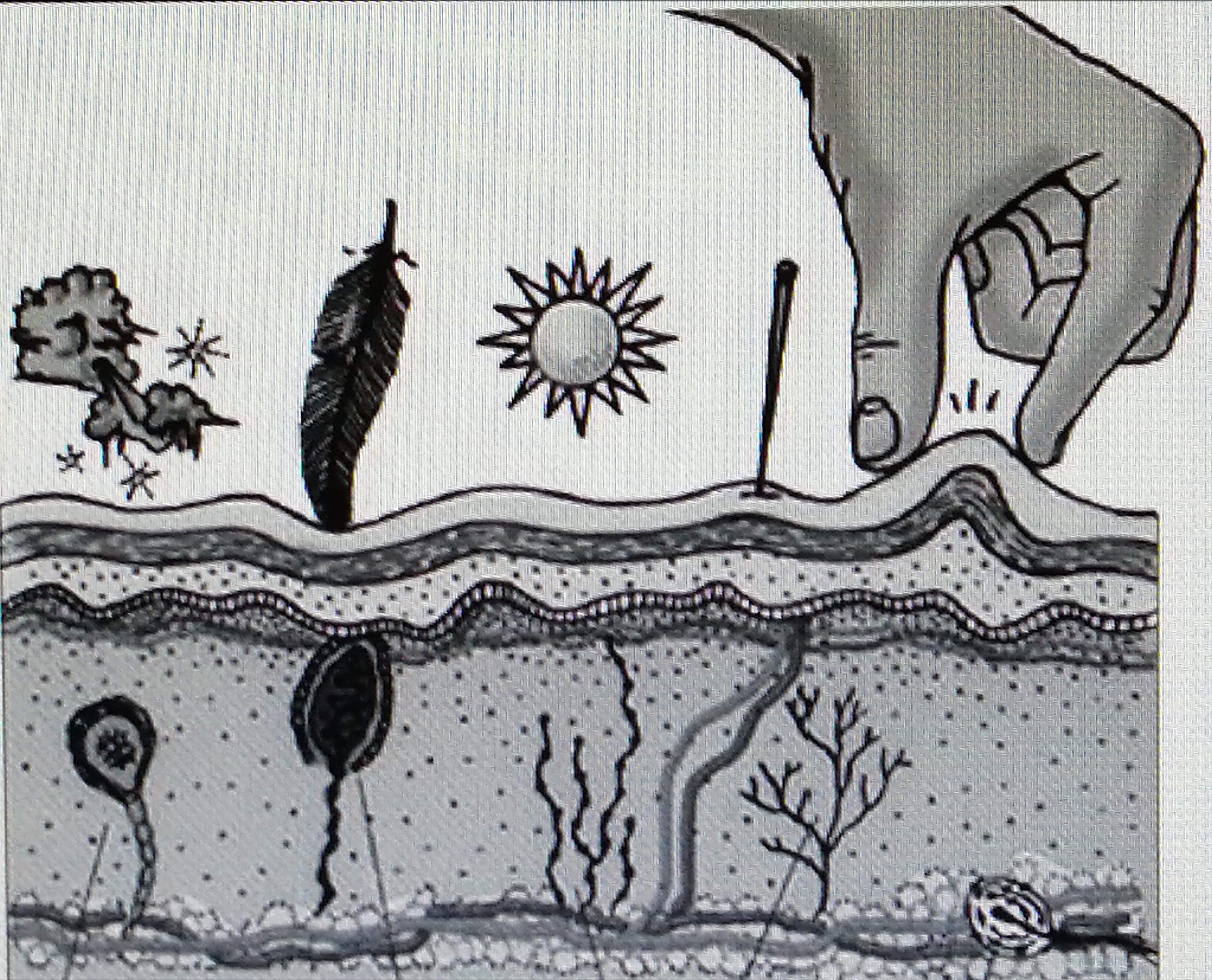 на картинке изображено осязание, человек может воспринимать окружающий мир через прикосновения, с помощью рецепторов на теле, слизистых, в мышцах, они способны различать температуру (терморецепторы), уровень давления (барорецепторы), а также боль.