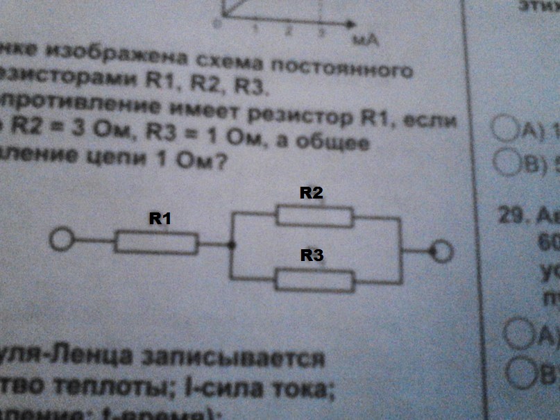 На рисунке изображена схема постоянного тока с резисторами R1, R2, R3. Какое сопротивление имеет резистор R1, если резистор R2 = 3 Ом, R3 = 1 Ом, а общее сопротивление цепи 1 Ом?