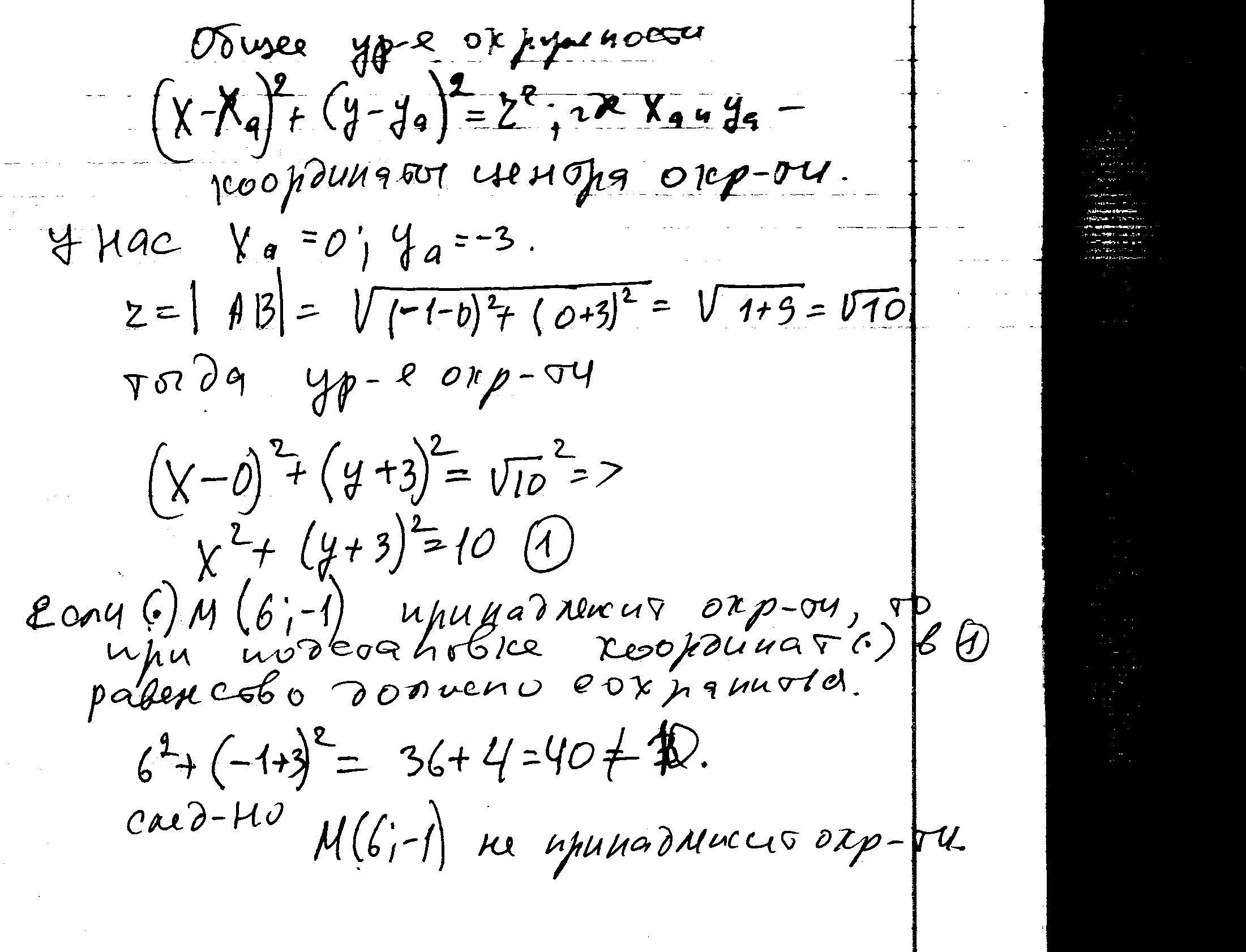 Даны точки А(0;-3),B(-1;0). Запишите уравнение окружности с центром в точке A и радиусом AB. Принадлежит ли этой окружности точка M(6;-1)?
