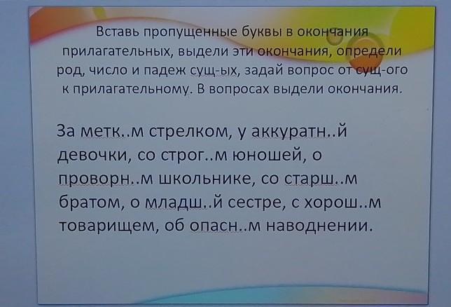Вставь пропущенные буквы в окончания прилагательных Выделите окончания, Определи род, число и падеж существительных, задай вопрос от существительного к прилагательному. в вопросах Выдели окончания.