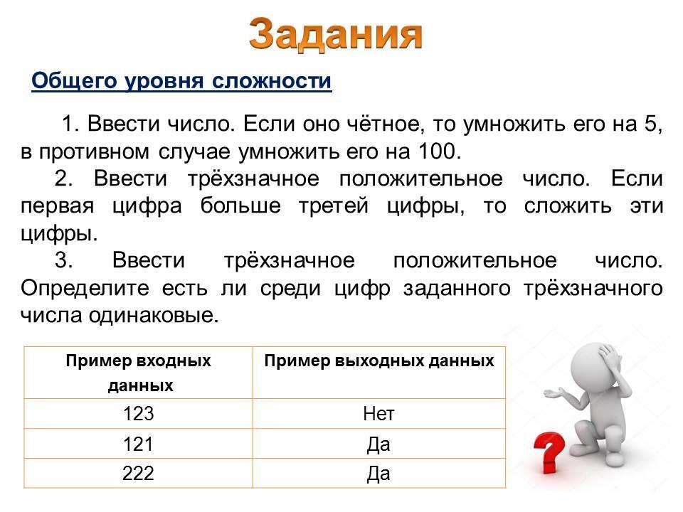 1.Ввести число.Если оно четное,то умножить его на 5,в противном случае умножить его на 100. 2.Ввести трехзначное положительное число.Если первая цифра больше третий цифры,то сложить эти цифры. 3.Ввести трехзначное положительное число.Определить есть ли среди цифр заданного трехзначного числа одинаковые.