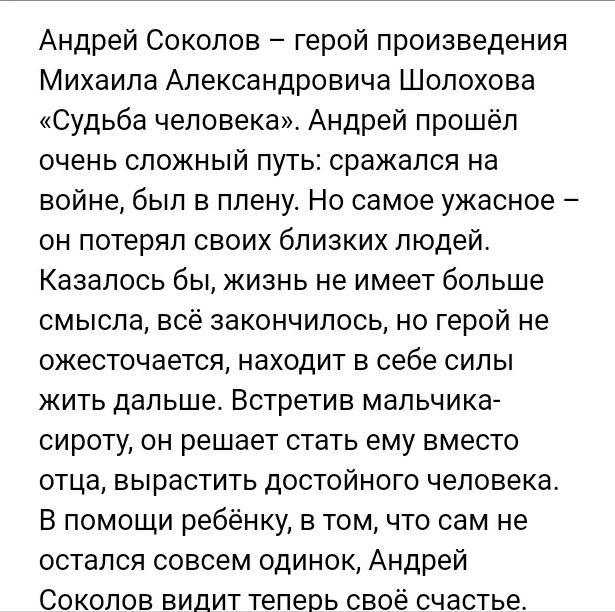 Довоенная жизнь героя небогата событиями. Гражданская война, голодная юность, работа в плотницкой артели, а потом на заводе и за баранкой машины, женитьба, дети, домишко о двух комнатах — всё это приметы самой обычной биографии человека того поколения, к которому принадлежал Андрей Соколов. Но именно в этой хоть и небогатой, но вполне устроенной жизни видит герой простое человеческое счастье: “Чего ещё надо? дети кашу едят с молоком, крыша над головою есть, одеты, обуты, стало быть, всё в порядке”.