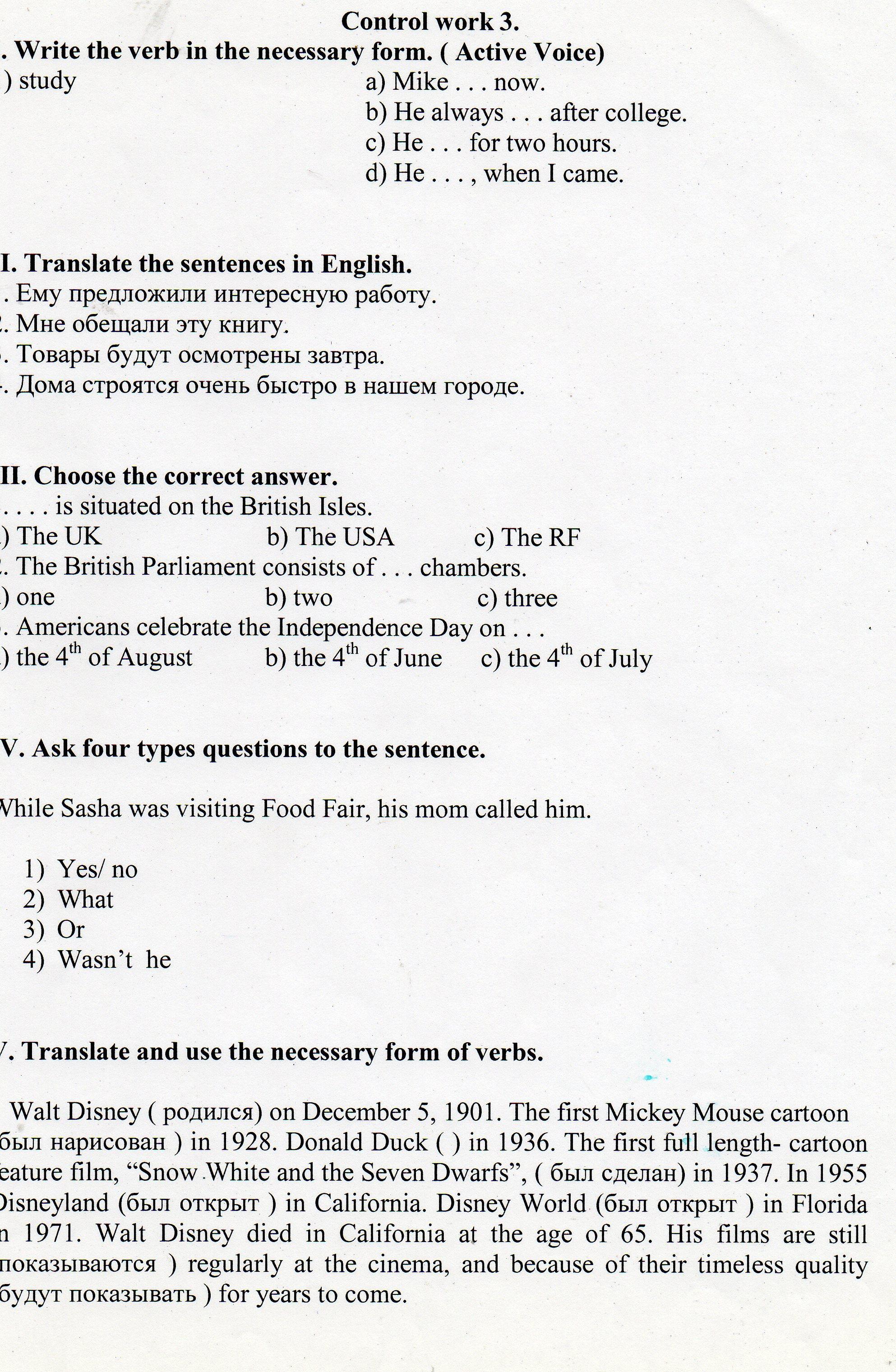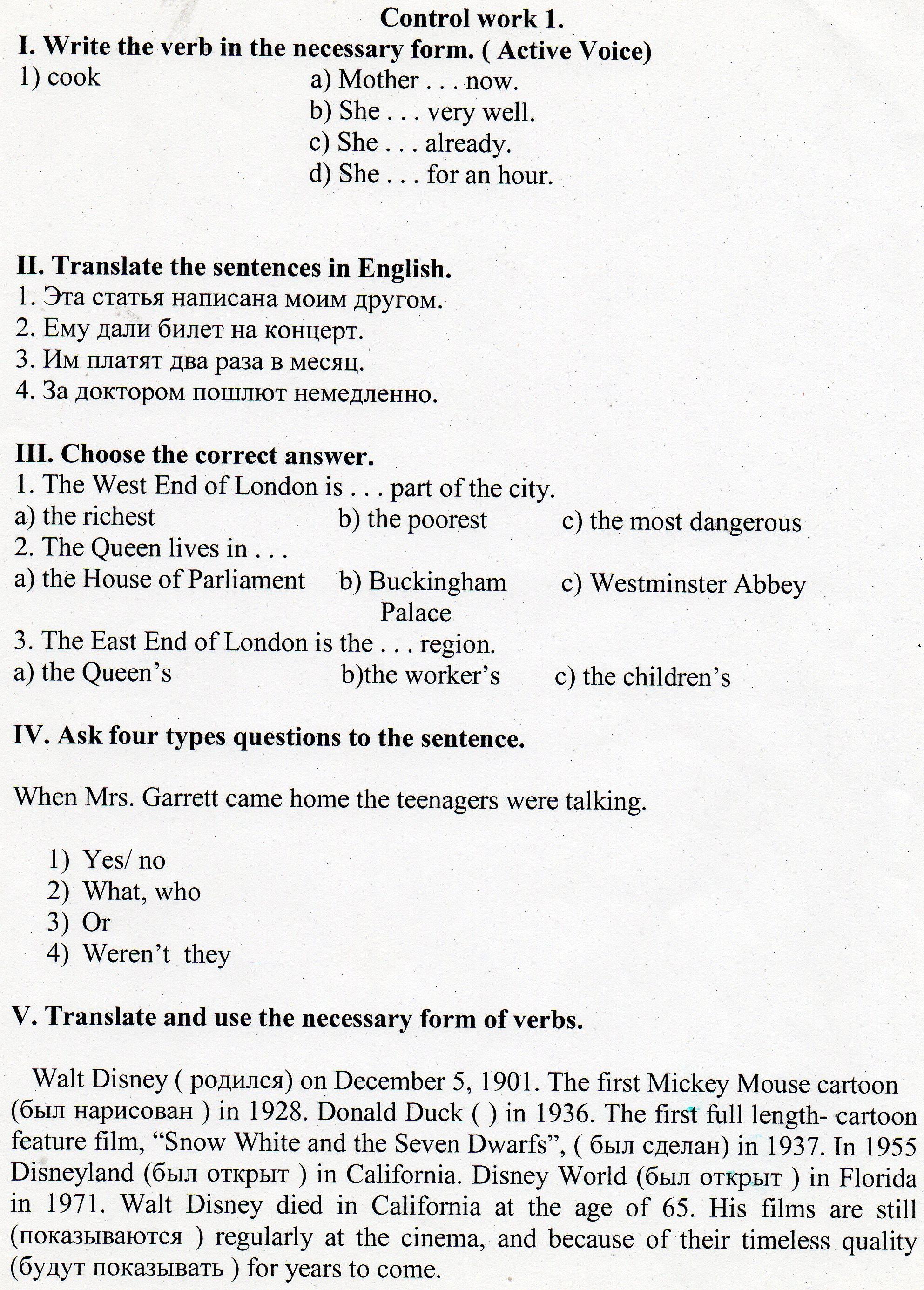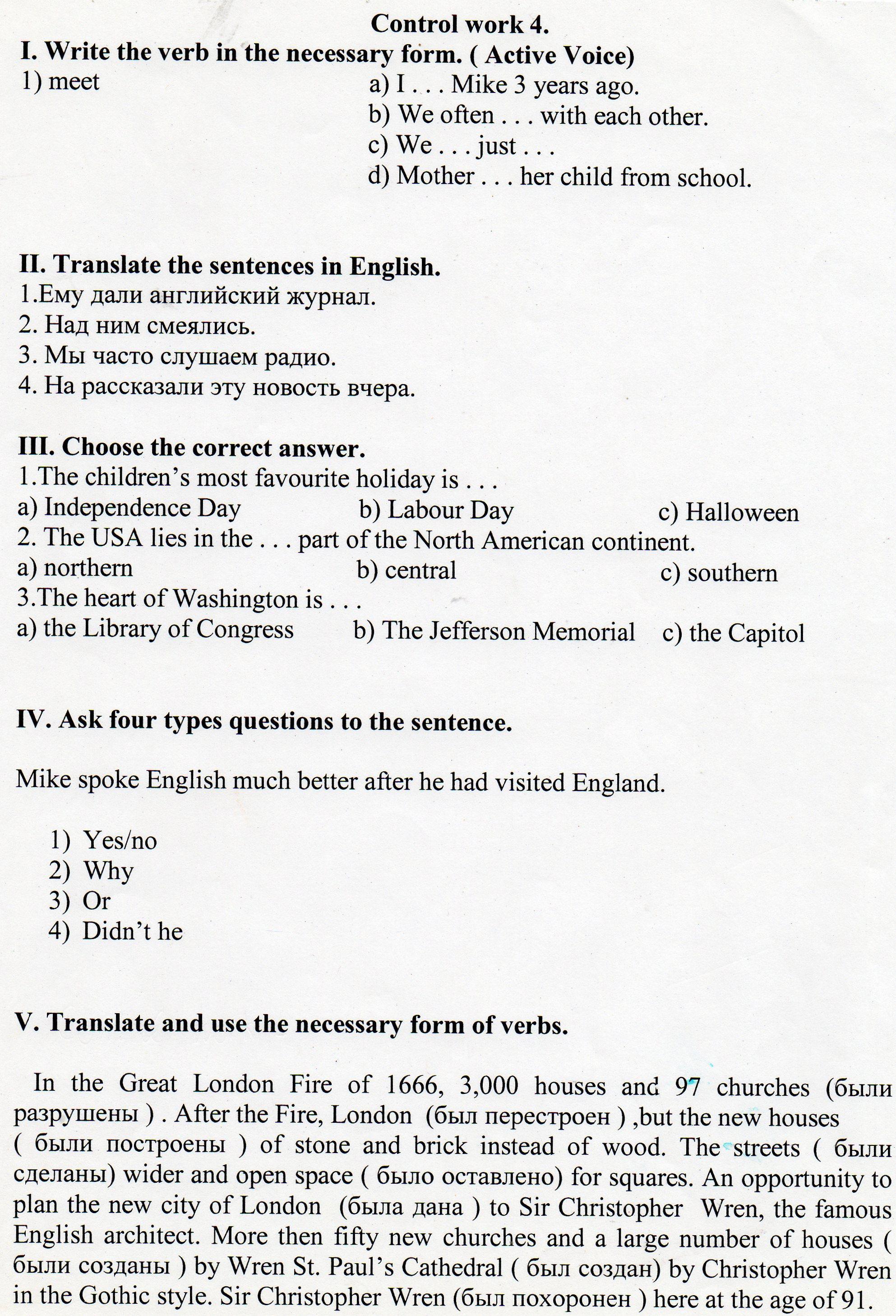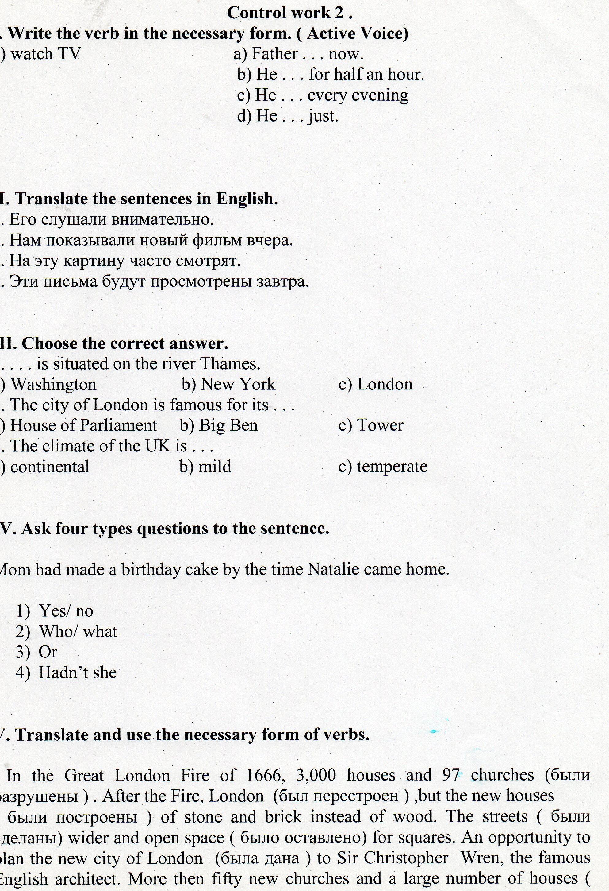 Контрольная работа 2. Напишите глагол в нужной форме. (Активный голос)) смотреть телевизор папа ... сейчас. б) Он ... на полчаса. в) он ... каждый вечер г) он ... просто. I. Переведите предложения на английский. Ero cnyuaIH BHHMATENÜHO. Ветчина IOKA36IBAIH HOBBIÉ OHJILM BYEPA. Ха 3ры капТУХЫ ЯКТО КМОПАТ. . I IHCLMA őynyT npocMoTpeHbl 3aBTpa. II. Выберите правильный ответ. .... расположен на реке Темзе. Вашингтон Город Лондон славится своим ...) Домом парламента б) Биг Беном Климат в Великобритании ...) континентальный б) Нью-Йорк в) Лондон в) Башня б) мягкий в) умеренный В. Спросите четыре типа вопросов в предложении. Мама сделала торт ко дню рождения, когда Натали вернулась домой. 1) Да / Нет 2) Кто / что 3) Или 4) Не она. Переведите и используйте необходимую форму глаголов. В Великом лондонском пожаре 1666 года 3000 домов и 97 церквей (6BIIH a3pyuieHbi). После пожара Лондон (6b1 nepecrpoeH), но новые дома ÓLLIH nocrpoeHbI) из камня и кирпича вместо дерева. Улицы (66IJIH nenaHbI) шире и открытое пространство (6LI1O OCTABIEHO) для площадей. Возможность посетить новый город Лондон (6bina NaHa) для сэра Кристофера Рена, известного английского архитектора. Более пятидесяти новых церквей и большое количество домов ( это перевод