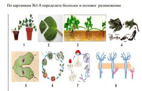по картинкам номер 1-8 определите размножения бесполое и половое размножение.​