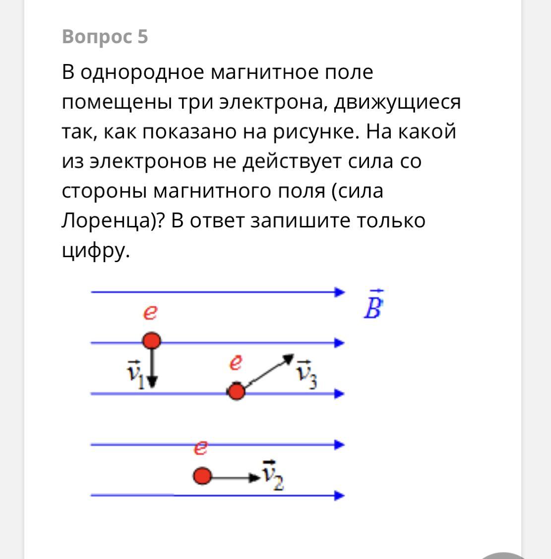 В однородное магнитное поле помещены три электрона, движущиеся так, как показано на рисунке. На какой из электронов не действует сила со стороны магнитного поля (сила Лоренца)? В ответ запишите только цифру.