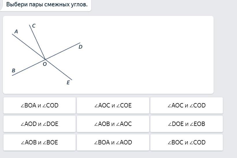 Смотри вроде так: AOD и DOE, AOB и BOE, AOC и COE, BOA и АОD, DOE и EOB, BOC и COB