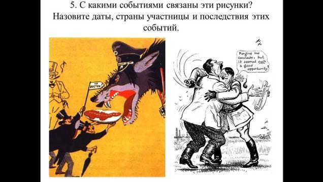 На 1 рисунке собака это Гитлер пригрозил 2 странам, на 2 рисунке Сталин и Гитлер дерутся то-есть Великая Отечественная Война