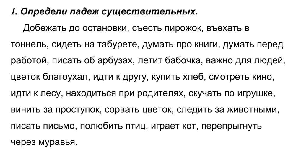 1. Остановки - Родительный, пирожок - винительный, тоннель - винительный, табурете - предложный, книги - винительный, работой - творительный, арбузах - предложный, бабочка - именительный, людей - родительный, цветок - именительный, другу - дательный, хлеб - винительный, кино - винительный, лесу - дательный, родителях - предложный, игрушке - дательный, проступок - винительный, цветок - винительный, животными - творительный, письмо - винительный, птиц - винительный, кот - именительный, муравья - винительный.