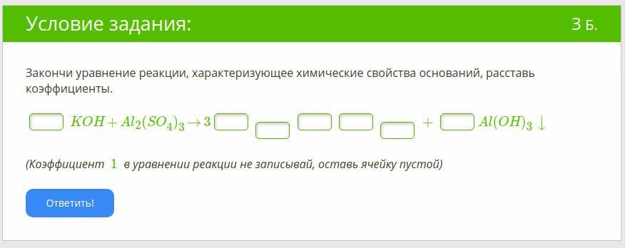 Закончи уравнение реакции, характеризующее химические свойства оснований, расставь коэффициенты.