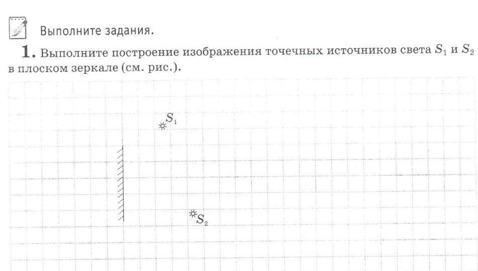 Выполните построение изображения точечных источников Света S1 и S2 в плоском зеркале