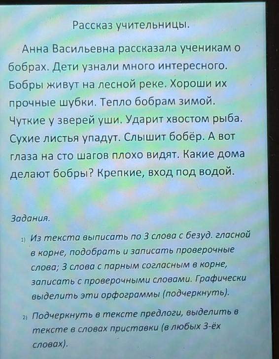 Анна Васильевна рассказала ученикам о_бобрах. Дети узнали много интересного. Бобры живут на_лесной реке. Хороши их прочные шубки. Тепло бобрам зимой. Чуткие у_зверей уши. Ударит хвостом рыба. Сухие листья упадут. Слышит бобер. А вот глаза на_сто шагов видят плохо.Какие дома делают бобры ? Крепкие, вход под_водой.