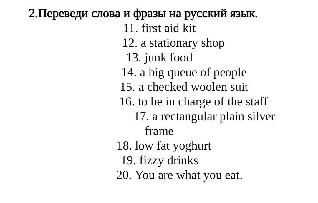 11. аптечка первой помощи 12. стационарный магазин 13. нездоровая пища 14. большая очередь людей 15. шерстяной костюм в клетку 16. ответственность за персонал 17. прямоугольная простая серебряная рамка 18. обезжиренный йогурт 19. газированные напитки 20. Вы то, что вы едите.