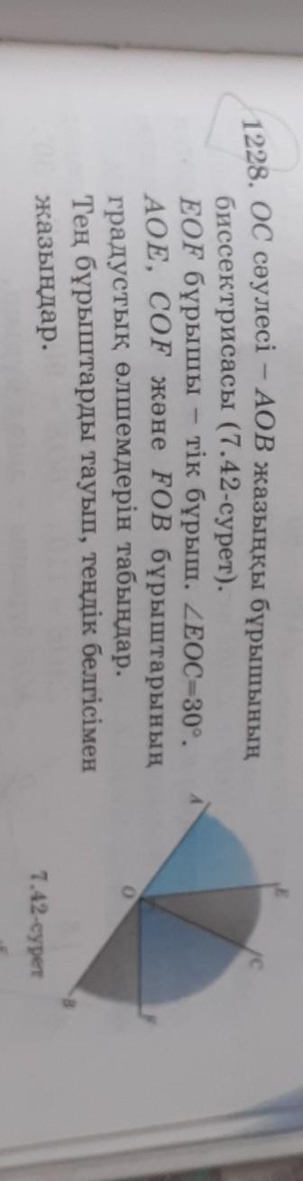 OS сәулесі-AOB жазыңқы бұрышының биссектрисасы EOF бұрышы- тік бұрыш.EOC =30°.AOE, COF және FOB бұрыштарының градустық өлшемдерін табыңдар.тең бұрыштарды тауып теңдік белгісімен жазыңдар