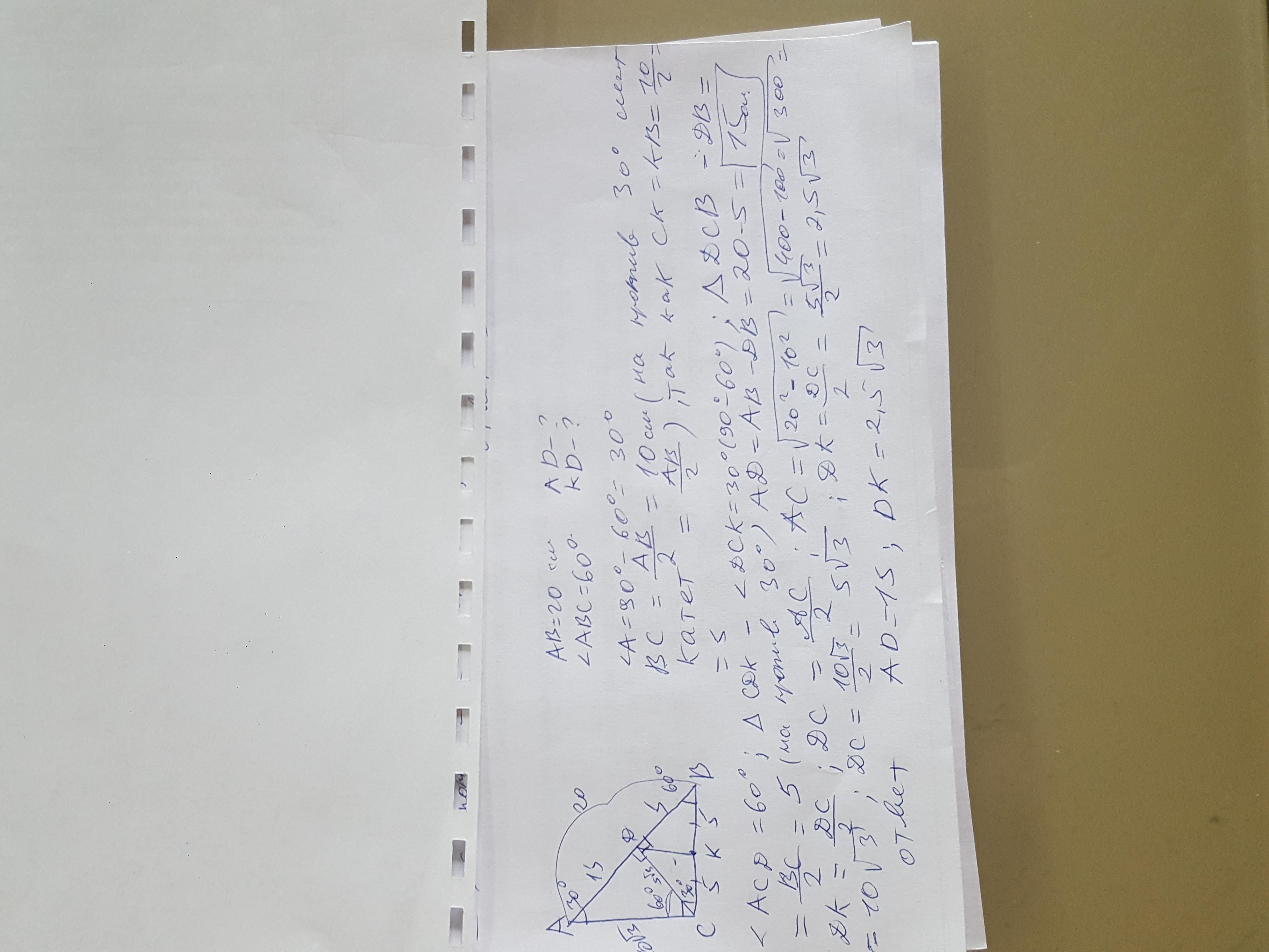 B прямоугольном треугольнике ABC к гипотенузе AB проведена высота CD; K – середина BC. Найдите AD и KD, если ∠ ABC = 60°, AB = 20 см.
