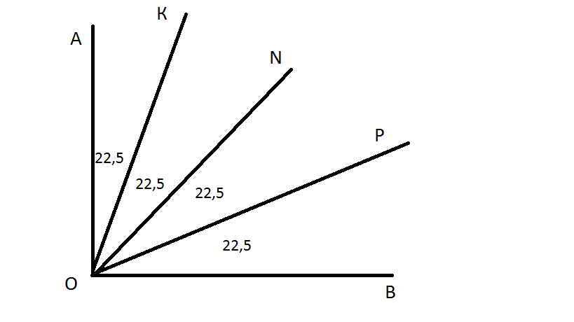 Так как уголАОВ=90 градусов, а ОN-его биссектриса, то угол АON=NOB=45градусов. ОК - биссектриса угла AON, т е AOK=KON=45/2=22,5 градуса. ОР - биссектриса угла NOB => угол NOP=POB=45/2=22,5 градуса.