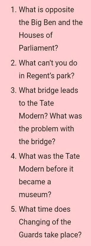 1. Что находится напротив Биг Бен и здания Парламента? 2. Что вы не можете сделать в Риджентс-парке? 3. Какой мост ведет в Тейт Модерн? В чем была проблема с мостом? 4. Чем был Тейт Модерн до того, как он стал музеем? 5. Во сколько происходит смена караула?