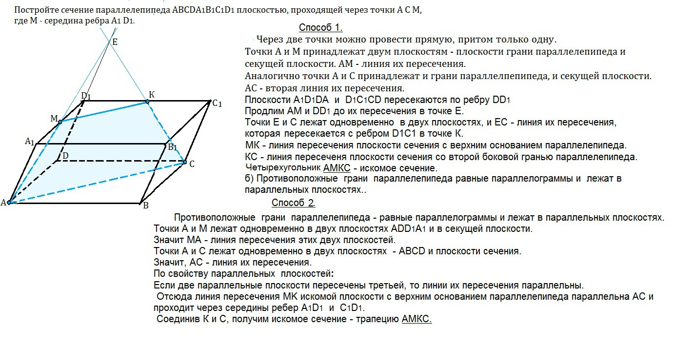 постройте сечение параллелепипеда ABCD A1B1C1D1 плоскостью проходящей через точки A C M, где М середина ребра A1 D1