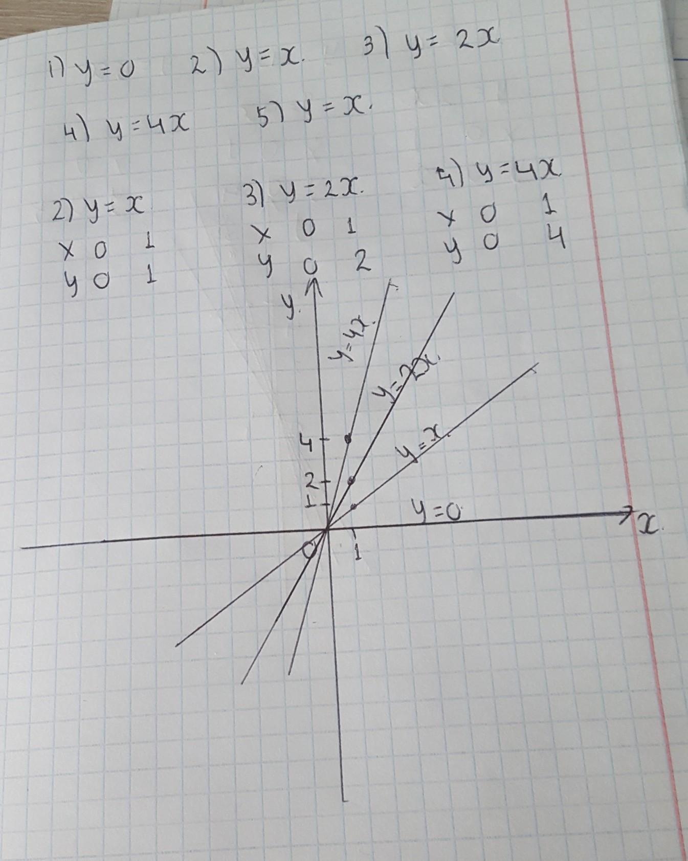 3) y=2x; 4) y=4x; 5) y=x.
