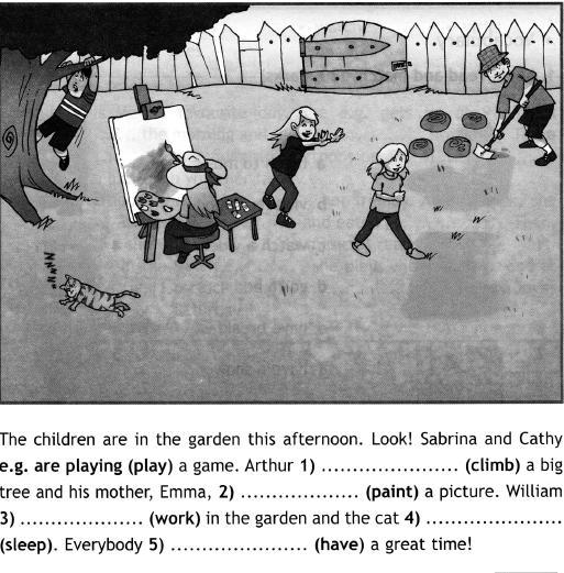 5) 1. is climbing 2. is painting 3. is working 4. is sleeping 5. is having