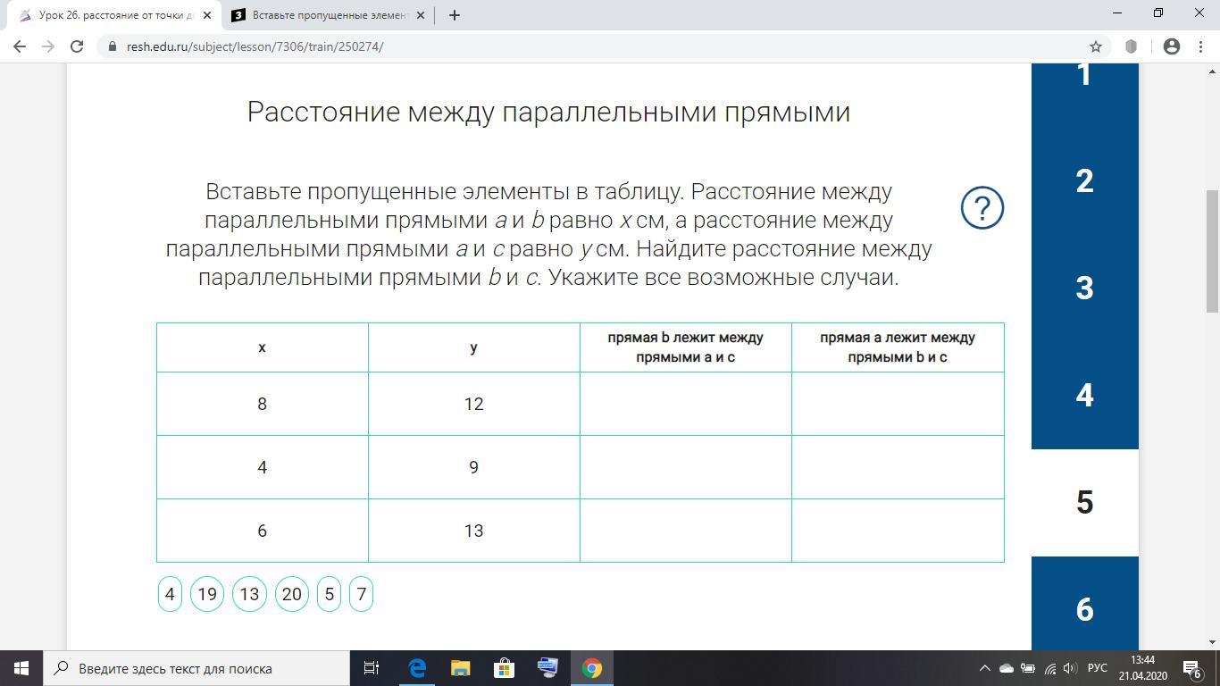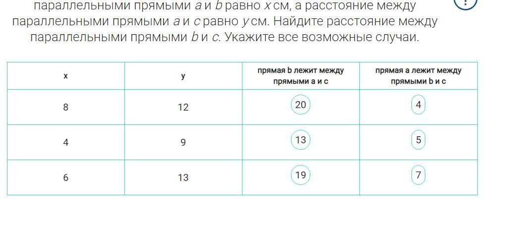 Вставьте пропущенные элементы в таблицу. Расстояние между параллельными прямыми a и b равно x см, а расстояние между параллельными прямыми a и c равно y см. Найдите расстояние между параллельными прямыми b и c. Укажите все возможные случаи.