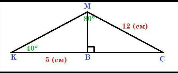 В остроугольном треугольнике МСК проведена высота МВ. Найдите СК, если ∡М = 80° , ∡К = 40°, МС = 12, КВ = 5.