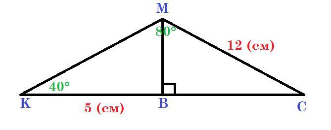 В остроугольном треугольнике МСК проведена высота МВ. Найдите СК, если ∡М = 80° , ∡К = 40°, МС = 12, КВ = 5.