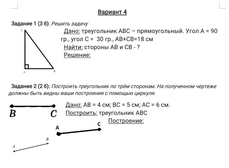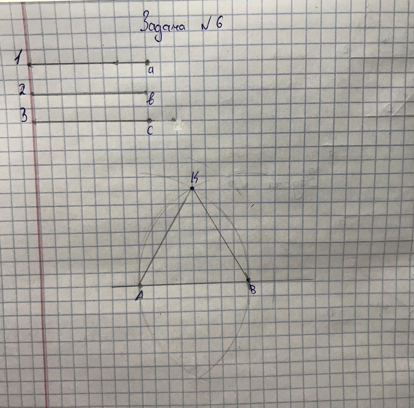 На моих фото это задание №6. Сначала чертим три стороны (4см, 5см, 6см) вверху. Потом чертим картинку и ход построения. В вашей задаче при построении каждой стороны используйте сантиметры, которые должны быть (4, 5, 6)