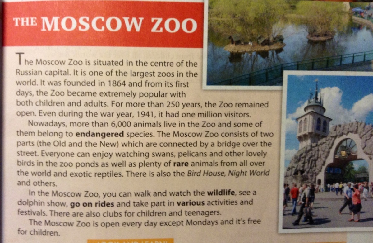 Московский Зоопарк расположен в центре Российской столицы. Это один из крупнейших зоопарков в мире. Он был основан в 1864 году и с первых дней, Зоопарк стал чрезвычайно популярным среди детей и взрослых. Для более чем 250 лет, Зоопарк оставался открытым. Даже во время войны году, в 1941 году, это был один миллион посетителей.