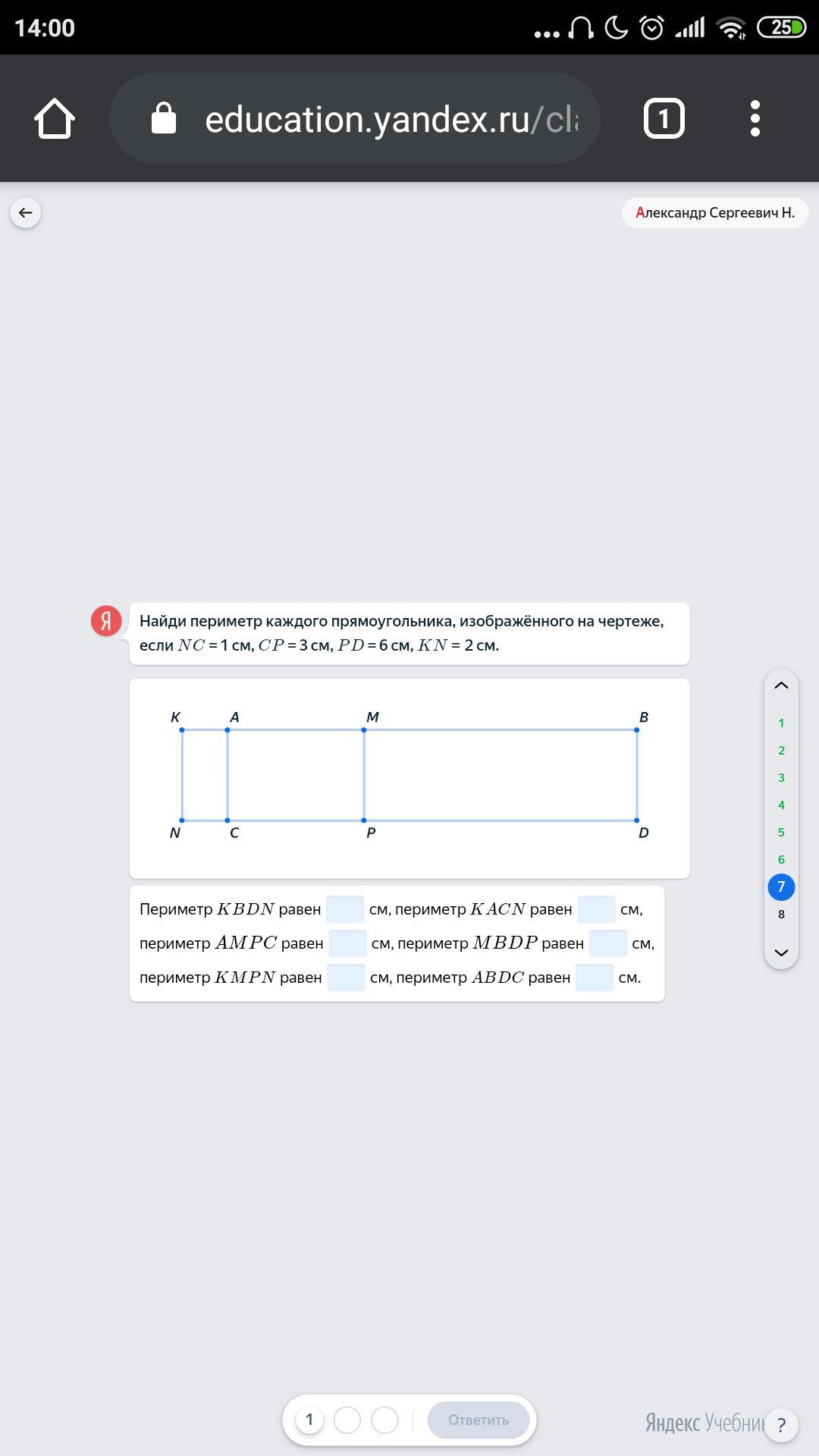 Найди периметр каждого прямоугольника, изображённого на чертеже, если NCNC = 1 см CPCP = 3 см, PDPD = 6 см, KNKN = 2 см.