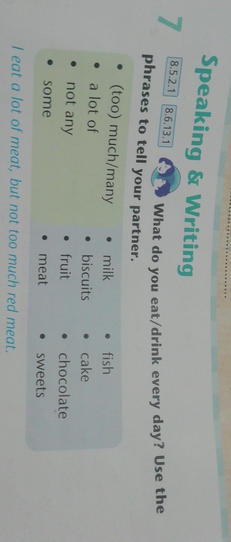 I eat many biscuits, a lot of meat, drink some milk, eat much fruit and not any sweets.