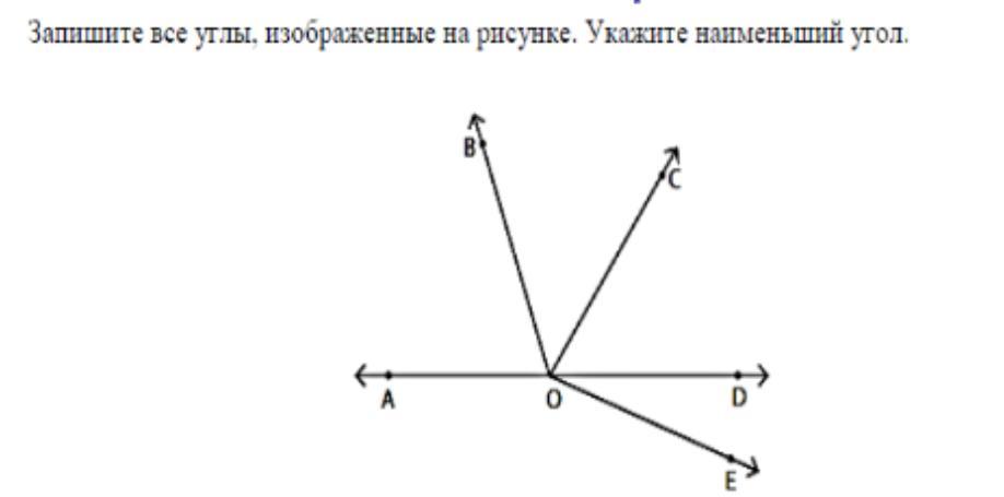 Пошаговое объяснение:∠АOB, ∠AOC, ∠AOD, ∠AOE, ∠EOD, ∠DOC, ∠DOB, ∠EOC, ∠EOB, ∠BOC Наименьший угол ЕOD