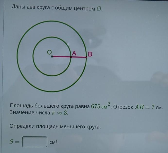 Площадь круга равна 675 см². Отрезок AB = 7см. Значение числа π ≈ 3.