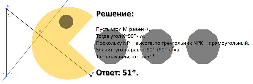 Из вершины N прямого угла треугольника MNK проведена высота NP . Найдите угол PNK ,если угол M равен 51 градус